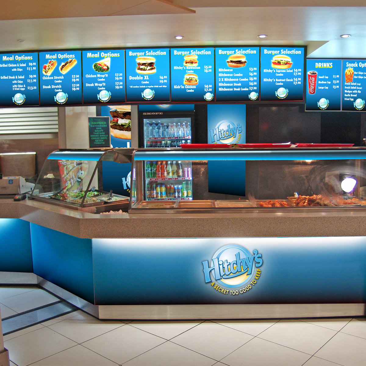 The client had obtained leases in three mall food courts for a brand-new burger chain. He required company branding from scratch, an easily identified logo and layouts for three separate locations that stood out from the competition.